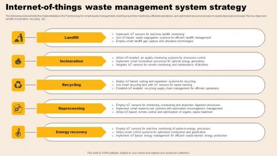 The following slide exhibits the implementation of IoT technology for smart waste management, enabling real-time monitoring, efficient operations, and optimized resource recovery in waste disposal processes The key steps are landfill, incineration, recycling, etc. Pitch your topic with ease and precision using this Internet Of Things Waste Management System Strategy Diagrams Pdf. This layout presents information on Landfill, Incineration, Recycling. It is also available for immediate download and adjustment. So, changes can be made in the color, design, graphics or any other component to create a unique layout. The following slide exhibits the implementation of IoT technology for smart waste management, enabling real-time monitoring, efficient operations, and optimized resource recovery in waste disposal processes The key steps are landfill, incineration, recycling, etc.