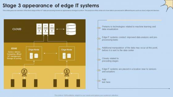 This slide gives an overview of the third stage of the IoT data processing known as appearance of edge it system. The purpose of this slide is to how data is processed in different layers such as cloud, edge and devices. Find a pre-designed and impeccable Stage 3 Appearance Of Edge IT Systems Internet Of Things Analysis Clipart Pdf. The templates can ace your presentation without additional effort. You can download these easy-to-edit presentation templates to make your presentation stand out from others. So, what are you waiting for Download the template from Slidegeeks today and give a unique touch to your presentation. This slide gives an overview of the third stage of the IoT data processing known as appearance of edge it system. The purpose of this slide is to how data is processed in different layers such as cloud, edge and devices.