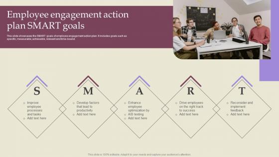 This slide showcases the SMART goals of employee engagement action plan. It includes goals such as specific, measurable, achievable, relevant and time-bound. Create an editable Employee Involvement Tactics Employee Engagement Action Plan Smart Goals Clipart Pdf that communicates your idea and engages your audience. Whether you are presenting a business or an educational presentation, pre-designed presentation templates help save time. Employee Involvement Tactics Employee Engagement Action Plan Smart Goals Clipart Pdf is highly customizable and very easy to edit, covering many different styles from creative to business presentations. Slidegeeks has creative team members who have crafted amazing templates. So, go and get them without any delay. This slide showcases the SMART goals of employee engagement action plan. It includes goals such as specific, measurable, achievable, relevant and time-bound.