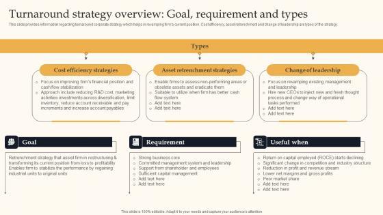 This slide provides information regarding turnaround corporate strategy which helps in revamping firms current position. Cost efficiency, asset retrenchment and change of leadership are types of the strategy. If you are looking for a format to display your unique thoughts, then the professionally designed Table Of Contents Key Business Tactics For Organizational Success Guidelines Pdf is the one for you. You can use it as a Google Slides template or a PowerPoint template. Incorporate impressive visuals, symbols, images, and other charts. Modify or reorganize the text boxes as you desire. Experiment with shade schemes and font pairings. Alter, share or cooperate with other people on your work. Download Turnaround Strategy Overview Goal Key Business Tactics For Organizational Success Pictures Pdf and find out how to give a successful presentation. Present a perfect display to your team and make your presentation unforgettable. This slide provides information regarding turnaround corporate strategy which helps in revamping firms current position. Cost efficiency, asset retrenchment and change of leadership are types of the strategy.