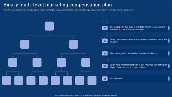 This slide represents binary compensation plan in network marketing for managers and distributors. It covers details regarding teamwork, binary tree structure, front line distributor etc. The best PPT templates are a great way to save time, energy, and resources. Slidegeeks have 100 percent editable powerpoint slides making them incredibly versatile. With these quality presentation templates, you can create a captivating and memorable presentation by combining visually appealing slides and effectively communicating your message. Download Binary Multi Level Marketing Effective Network Marketing Promotion Tactics Elements Pdf from Slidegeeks and deliver a wonderful presentation. This slide represents binary compensation plan in network marketing for managers and distributors. It covers details regarding teamwork, binary tree structure, front line distributor etc.