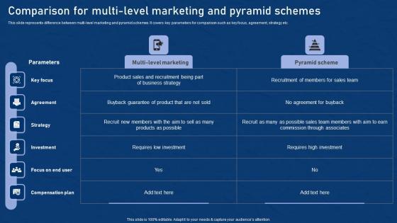 This slide represents difference between multi level marketing and pyramid schemes. It covers key parameters for comparison such as key focus, agreement, strategy etc. Retrieve professionally designed Comparison For Multi Level Marketing Effective Network Marketing Promotion Tactics Inspiration Pdf to effectively convey your message and captivate your listeners. Save time by selecting pre made slideshows that are appropriate for various topics, from business to educational purposes. These themes come in many different styles, from creative to corporate, and all of them are easily adjustable and can be edited quickly. Access them as PowerPoint templates or as Google Slides themes. You do not have to go on a hunt for the perfect presentation because Slidegeeks got you covered from everywhere. This slide represents difference between multi level marketing and pyramid schemes. It covers key parameters for comparison such as key focus, agreement, strategy etc.
