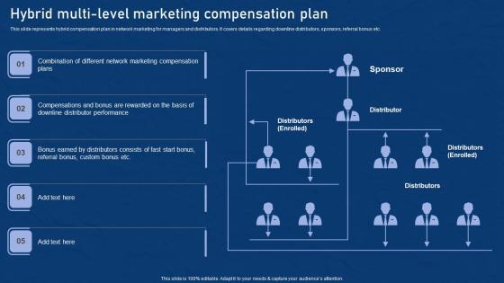 This slide represents hybrid compensation plan in network marketing for managers and distributors. It covers details regarding downline distributors, sponsors, referral bonus etc. There are so many reasons you need a Hybrid Multi Level Marketing Effective Network Marketing Promotion Tactics Designs Pdf. The first reason is you can not spend time making everything from scratch, Thus, Slidegeeks has made presentation templates for you too. You can easily download these templates from our website easily. This slide represents hybrid compensation plan in network marketing for managers and distributors. It covers details regarding downline distributors, sponsors, referral bonus etc.