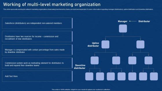 This slide represents working for network marketing organization showcasing how hierarchy chains are build and expanded. It covers information regarding manager distributors, upline distributors and downline distributors. The best PPT templates are a great way to save time, energy, and resources. Slidegeeks have 100 percent editable powerpoint slides making them incredibly versatile. With these quality presentation templates, you can create a captivating and memorable presentation by combining visually appealing slides and effectively communicating your message. Download Working Of Multi Level Marketing Effective Network Marketing Promotion Tactics Inspiration Pdf from Slidegeeks and deliver a wonderful presentation. This slide represents working for network marketing organization showcasing how hierarchy chains are build and expanded. It covers information regarding manager distributors, upline distributors and downline distributors.