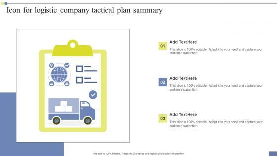 Pitch your topic with ease and precision using this Icon For Logistic Company Tactical Plan Summary Themes Pdf. This layout presents information on Icon For Logistic Company, Tactical Plan Summary. It is also available for immediate download and adjustment. So, changes can be made in the color, design, graphics or any other component to create a unique layout. Our Icon For Logistic Company Tactical Plan Summary Themes Pdf are topically designed to provide an attractive backdrop to any subject. Use them to look like a presentation pro.