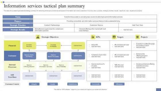 The slide showcases organizational strategy summary for delivering enhanced connectivity and speed of information services to customers. It covers vision, purpose, strategic priorities, results, objectives, kpis, targets and projects. Pitch your topic with ease and precision using this Information Services Tactical Plan Summary Slides Pdf. This layout presents information on Information Services, Tactical Plan Summary, Strategic Priorities, Targets And Projects. It is also available for immediate download and adjustment. So, changes can be made in the color, design, graphics or any other component to create a unique layout. The slide showcases organizational strategy summary for delivering enhanced connectivity and speed of information services to customers. It covers vision, purpose, strategic priorities, results, objectives, kpis, targets and projects.