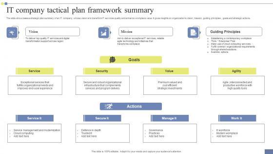 The slide showcases a strategic plan summary of an IT company, whose vision is to transform IT services quality and enhance workplace value. It gives insights on organizations vision, mission, guiding principles, goals and strategic actions. Showcasing this set of slides titled IT Company Tactical Plan Framework Summary Demonstration Pdf. The topics addressed in these templates are IT Company Tactical, Plan Framework Summary, Organization Vision, Guiding Principles. All the content presented in this PPT design is completely editable. Download it and make adjustments in color, background, font etc. as per your unique business setting. The slide showcases a strategic plan summary of an IT company, whose vision is to transform IT services quality and enhance workplace value. It gives insights on organizations vision, mission, guiding principles, goals and strategic actions.