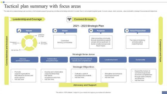 The slide showcases strategic plan summary which explains support groups key priorities and strategic direction to enable them to accomplish targeted goals. It covers values, vision, purpose , value proposition, strategic focus areas and objectives. Pitch your topic with ease and precision using this Tactical Plan Summary With Focus Areas Diagrams Pdf. This layout presents information on Strategic Plan Summary, Priorities And Strategic Direction, Targeted Goals, Value Proposition. It is also available for immediate download and adjustment. So, changes can be made in the color, design, graphics or any other component to create a unique layout. The slide showcases strategic plan summary which explains support groups key priorities and strategic direction to enable them to accomplish targeted goals. It covers values, vision, purpose , value proposition, strategic focus areas and objectives.