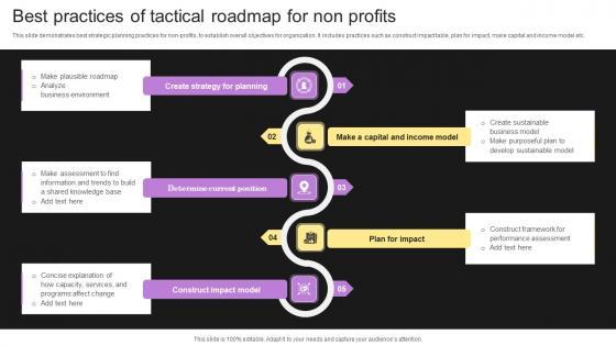 This slide demonstrates best strategic planning practices for non profits, to establish overall objectives for organization. It includes practices such as construct impact table, plan for impact, make capital and income model etc.Showcasing this set of slides titled Best Practices Of Tactical Roadmap For Non Profits Infographics Pdf The topics addressed in these templates are Determine Current Position, Construct Impact Model, Performance Assessment All the content presented in this PPT design is completely editable. Download it and make adjustments in color, background, font etc. as per your unique business setting. This slide demonstrates best strategic planning practices for non profits, to establish overall objectives for organization. It includes practices such as construct impact table, plan for impact, make capital and income model etc.