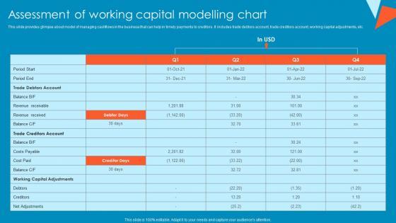 This slide provides glimpse about model of managing cashflows in the business that can help in timely payments to creditors. It includes trade debtors account, trade creditors account, working capital adjustments, etc.Formulating a presentation can take up a lot of effort and time, so the content and message should always be the primary focus. The visuals of the PowerPoint can enhance the presenters message, so our Assessment Of Working Capital Modelling Chart Tactical Financial Governance Inspiration Pdf was created to help save time. Instead of worrying about the design, the presenter can concentrate on the message while our designers work on creating the ideal templates for whatever situation is needed. Slidegeeks has experts for everything from amazing designs to valuable content, we have put everything into Assessment Of Working Capital Modelling Chart Tactical Financial Governance Inspiration Pdf This slide provides glimpse about model of managing cashflows in the business that can help in timely payments to creditors. It includes trade debtors account, trade creditors account, working capital adjustments, etc.