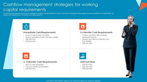 This slide provides glimpse about common strategies of cashflow management that can help our business in managing working capital. It includes immediate cash requirements, 3-6 months cash requirements, 6-12 months cash requirements, etc.Coming up with a presentation necessitates that the majority of the effort goes into the content and the message you intend to convey. The visuals of a PowerPoint presentation can only be effective if it supplements and supports the story that is being told. Keeping this in mind our experts created Cashflow Management Strategies For Working Tactical Financial Governance Themes Pdf to reduce the time that goes into designing the presentation. This way, you can concentrate on the message while our designers take care of providing you with the right template for the situation. This slide provides glimpse about common strategies of cashflow management that can help our business in managing working capital. It includes immediate cash requirements, 3-6 months cash requirements, 6-12 months cash requirements, etc.