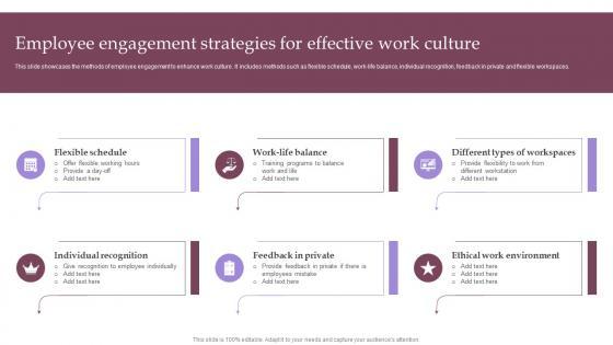 This slide showcases the methods of employee engagement to enhance work culture. It includes methods such as flexible schedule, work-life balance, individual recognition, feedback in private and flexible workspaces. There are so many reasons you need a Employee Involvement Tactics Employee Engagement Strategies For Effective Work Culture Clipart Pdf. The first reason is you can not spend time making everything from scratch, Thus, Slidegeeks has made presentation templates for you too. You can easily download these templates from our website easily. This slide showcases the methods of employee engagement to enhance work culture. It includes methods such as flexible schedule, work-life balance, individual recognition, feedback in private and flexible workspaces.