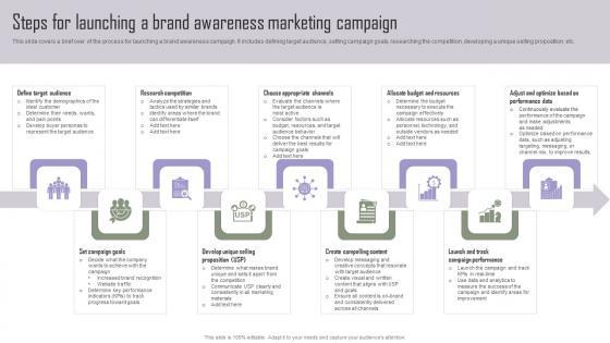 This slide covers a brief over of the process for launching a brand awareness campaign. It includes defining target audience, setting campaign goals, researching the competition, developing a unique selling proposition, etc. The Steps For Launching A Brand Implementing Marketing Tactics To Drive Mockup Pdf is a compilation of the most recent design trends as a series of slides. It is suitable for any subject or industry presentation, containing attractive visuals and photo spots for businesses to clearly express their messages. This template contains a variety of slides for the user to input data, such as structures to contrast two elements, bullet points, and slides for written information. Slidegeeks is prepared to create an impression. This slide covers a brief over of the process for launching a brand awareness campaign. It includes defining target audience, setting campaign goals, researching the competition, developing a unique selling proposition, etc.