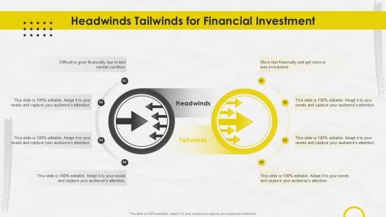 Create an editable Headwinds Tailwinds For Financial Investment that communicates your idea and engages your audience. Whether you are presenting a business or an educational presentation, pre-designed presentation templates help save time. Headwinds Tailwinds For Financial Investment is highly customizable and very easy to edit, covering many different styles from creative to business presentations. Slidegeeks has creative team members who have crafted amazing templates. So, go and get them without any delay. Our Headwinds Tailwinds for Financial Investment presentation slides are designed to explain the headwinds against any financial market clearly, while analyzing some of the factors challenging it, such as economic downturns or regulatory changes, and some opportunities offered by tailwinds, like market growth or technological advancements. Thus, while it is a bit lengthy and wordy, it delivers a concise expression with the help of visually appealing layouts, which makes this template perfect for investors and financial analysts to give a meaningful presentation.