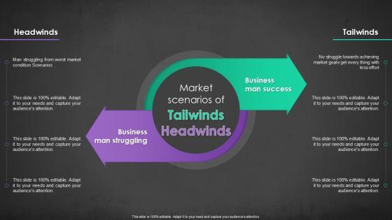 Slidegeeks has constructed Market Scenarios Of Headwinds Tailwinds after conducting extensive research and examination. These presentation templates are constantly being generated and modified based on user preferences and critiques from editors. Here, you will find the most attractive templates for a range of purposes while taking into account ratings and remarks from users regarding the content. This is an excellent jumping-off point to explore our content and will give new users an insight into our top-notch PowerPoint Templates. Our slides on market scenarios of headwinds tailwinds in our PowerPoint presentation are thoughtfully designed for a visually pleasing and informative presentation on market dynamics. These slides explore headwind forces, such as economic pressures or geopolitical tensions, and tailwind forces, which include factors such as technological advances or modifications in policy, affecting different industries. Whether you are presenting to a stakeholder, investor, or colleagues, these slides provide an engaging background that helps to present potentially complex market scenarios to stakeholders. Use this template for looking like a true presentation pro and drive impactful discussions.