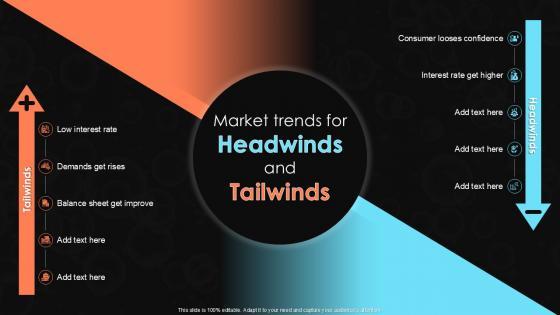 Presenting this PowerPoint presentation, titled Market Trends For Headwinds And Tailwinds, with topics curated by our researchers after extensive research. This editable presentation is available for immediate download and provides attractive features when used. Download now and captivate your audience. Presenting this Market Trends For Headwinds And Tailwinds. Our researchers have carefully researched and created these slides with all aspects taken into consideration. This is a completely customizable Market Trends For Headwinds And Tailwinds that is available for immediate downloading. Download now and make an impact on your audience. Highlight the attractive features available with our PPTs. Our Headwinds and Tailwinds Market Trends for PowerPoint templates offer you an opportunity to explain and discuss the headwinds as regulatory challenges or market downturns, which create a kind of resistance in a firms efforts, while tailwinds can be related to economic growth or new technologies emerging, all presented through visual, effective, and short content. These slides are perfect for stakeholders, investors, or strategic discussions and bring clarity with efficiency to enhance your presentations while ensuring that your insights stand out.