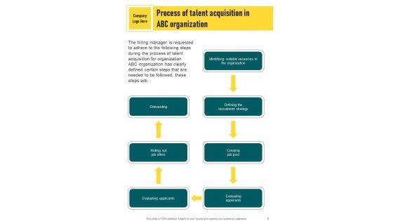 The hiring manager is requested to adhere to the following steps during the process of talent acquisition for organization ABC organization has clearly defined certain steps that are needed to be followed, these steps are. If you are looking for a format to display your unique thoughts, then the professionally designed SHRM Talent Management Guide Handbook For Enterprise Process Of Talent Acquisition In ABC Organization Designs PD is the one for you. You can use it as a Google Slides template or a PowerPoint template. Incorporate impressive visuals, symbols, images, and other charts. Modify or reorganize the text boxes as you desire. Experiment with shade schemes and font pairings. Alter, share or cooperate with other people on your work. Download SHRM Talent Management Guide Handbook For Enterprise Process Of Talent Acquisition In ABC Organization Designs PDF and find out how to give a successful presentation. Present a perfect display to your team and make your presentation unforgettable.