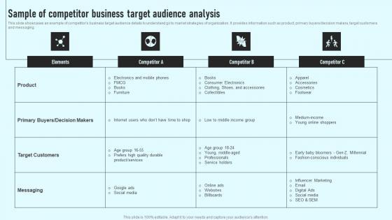This slide showcases an example of competitors business target audience details to understand go to market strategies of organization. It provides information such as product, primary buyers decision makers, target customers and messaging. Whether you have daily or monthly meetings, a brilliant presentation is necessary. Sample Of Competitor Business Target Audience Analysis Comprehensive Guide Sample Pdf can be your best option for delivering a presentation. Represent everything in detail using Sample Of Competitor Business Target Audience Analysis Comprehensive Guide Sample Pdf and make yourself stand out in meetings. The template is versatile and follows a structure that will cater to your requirements. All the templates prepared by Slidegeeks are easy to download and edit. Our research experts have taken care of the corporate themes as well. So, give it a try and see the results. This slide showcases an example of competitors business target audience details to understand go to market strategies of organization. It provides information such as product, primary buyers decision makers, target customers and messaging.