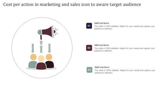 Pitch your topic with ease and precision using this Cost Per Action In Marketing And Sales Icon To Aware Target Audience Themes Pdf. This layout presents information on Cost Per Action, Marketing And Sales. It is also available for immediate download and adjustment. So, changes can be made in the color, design, graphics or any other component to create a unique layout. Our Cost Per Action In Marketing And Sales Icon To Aware Target Audience Themes Pdf are topically designed to provide an attractive backdrop to any subject. Use them to look like a presentation pro.