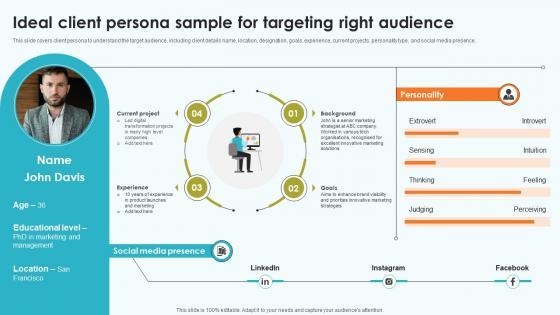 This slide covers client persona to understand the target audience, including client details name, location, designation, goals, experience, current projects, personality type, and social media presence. This Elevating Sales Networks Ideal Client Persona Sample For Targeting Right Audience SA SS V is perfect for any presentation, be it in front of clients or colleagues. It is a versatile and stylish solution for organizing your meetings. The Elevating Sales Networks Ideal Client Persona Sample For Targeting Right Audience SA SS V features a modern design for your presentation meetings. The adjustable and customizable slides provide unlimited possibilities for acing up your presentation. Slidegeeks has done all the homework before launching the product for you. So, do not wait, grab the presentation templates today This slide covers client persona to understand the target audience, including client details name, location, designation, goals, experience, current projects, personality type, and social media presence.