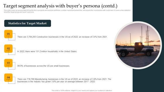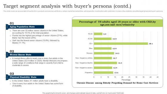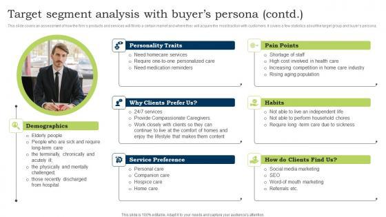 This slide covers an assessment of how the firms products and services will fit into a certain market and where they will acquire the most traction with customers. It covers a few statistics about the target group and buyers persona. Here you can discover an assortment of the finest PowerPoint and Google Slides templates. With these templates, you can create presentations for a variety of purposes while simultaneously providing your audience with an eye-catching visual experience. Download Target Segment Analysis With Buyers Persona Contd In Home Care Business Plan Demonstration Pdf to deliver an impeccable presentation. These templates will make your job of preparing presentations much quicker, yet still, maintain a high level of quality. Slidegeeks has experienced researchers who prepare these templates and write high-quality content for you. Later on, you can personalize the content by editing the Target Segment Analysis With Buyers Persona Contd In Home Care Business Plan Demonstration Pdf. This slide covers an assessment of how the firms products and services will fit into a certain market and where they will acquire the most traction with customers. It covers a few statistics about the target group and buyers persona.