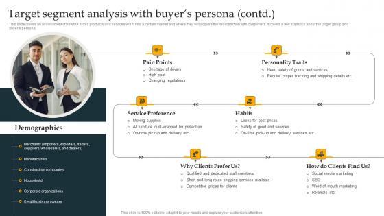 This slide covers an assessment of how the firms products and services will fit into a certain market and where they will acquire the most traction with customers. It covers a few statistics about the target group and buyers persona.Retrieve professionally designed Target Segment Analysis With Buyers Trucking Services Business Plan Summary Pdf to effectively convey your message and captivate your listeners. Save time by selecting pre-made slideshows that are appropriate for various topics, from business to educational purposes. These themes come in many different styles, from creative to corporate, and all of them are easily adjustable and can be edited quickly. Access them as PowerPoint templates or as Google Slides themes. You do not have to go on a hunt for the perfect presentation because Slidegeeks got you covered from everywhere. This slide covers an assessment of how the firms products and services will fit into a certain market and where they will acquire the most traction with customers. It covers a few statistics about the target group and buyers persona.