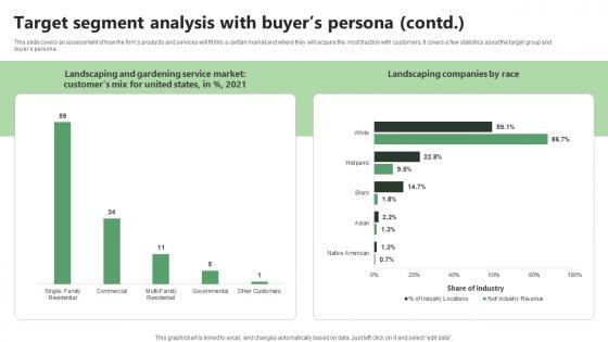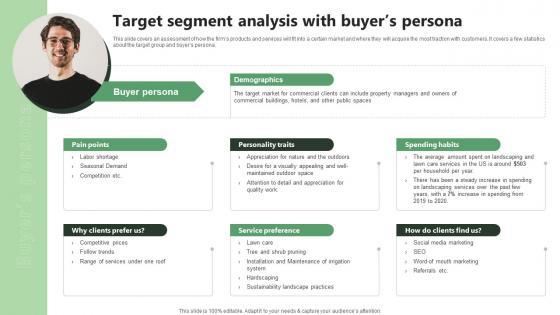 This slide covers an assessment of how the firms products and services will fit into a certain market and where they will acquire the most traction with customers. It covers a few statistics about the target group and buyers persona. Slidegeeks has constructed Target Segment Analysis With Buyers Persona Lawn Care BP SS V after conducting extensive research and examination. These presentation templates are constantly being generated and modified based on user preferences and critiques from editors. Here, you will find the most attractive templates for a range of purposes while taking into account ratings and remarks from users regarding the content. This is an excellent jumping-off point to explore our content and will give new users an insight into our top-notch PowerPoint Templates. This slide covers an assessment of how the firms products and services will fit into a certain market and where they will acquire the most traction with customers. It covers a few statistics about the target group and buyers persona.