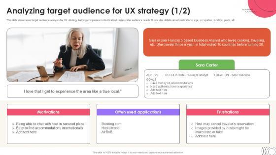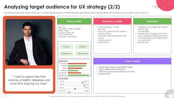 This slide showcases target audience analysis for UX strategy helping companies in identical industries cater audience needs. It provides details about motivations, age, occupation, location, goals, etc.Slidegeeks is one of the best resources for PowerPoint templates. You can download easily and regulate Analyzing Target Audience User Experience Design Ppt Sample Strategy SS V for your personal presentations from our wonderful collection. A few clicks is all it takes to discover and get the most relevant and appropriate templates. Use our Templates to add a unique zing and appeal to your presentation and meetings. All the slides are easy to edit and you can use them even for advertisement purposes. This slide showcases target audience analysis for UX strategy helping companies in identical industries cater audience needs. It provides details about motivations, age, occupation, location, goals, etc.