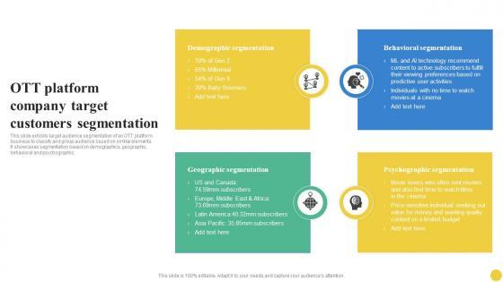This slide exhibits target audience segmentation of an OTT platform business to classify and group audience based on similar elements. It showcases segmentation based on demographics, geographic, behavioral and psychographic. Do you have to make sure that everyone on your team knows about any specific topic I yes, then you should give OTT Platform Company Target Customers Segmentation User Segmentation Diagrams Pdf a try. Our experts have put a lot of knowledge and effort into creating this impeccable OTT Platform Company Target Customers Segmentation User Segmentation Diagrams Pdf. You can use this template for your upcoming presentations, as the slides are perfect to represent even the tiniest detail. You can download these templates from the Slidegeeks website and these are easy to edit. So grab these today This slide exhibits target audience segmentation of an OTT platform business to classify and group audience based on similar elements. It showcases segmentation based on demographics, geographic, behavioral and psychographic.