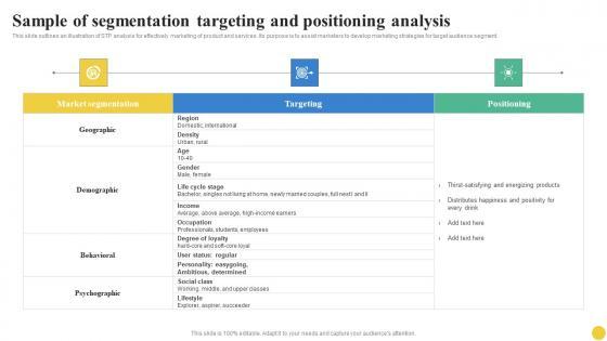 This slide outlines an illustration of STP analysis for effectively marketing of product and services. Its purpose is to assist marketers to develop marketing strategies for target audience segment. Whether you have daily or monthly meetings, a brilliant presentation is necessary. Sample Of Segmentation Targeting And Positioning Analysis User Segmentation Inspiration Pdf can be your best option for delivering a presentation. Represent everything in detail using Sample Of Segmentation Targeting And Positioning Analysis User Segmentation Inspiration Pdf and make yourself stand out in meetings. The template is versatile and follows a structure that will cater to your requirements. All the templates prepared by Slidegeeks are easy to download and edit. Our research experts have taken care of the corporate themes as well. So, give it a try and see the results. This slide outlines an illustration of STP analysis for effectively marketing of product and services. Its purpose is to assist marketers to develop marketing strategies for target audience segment.