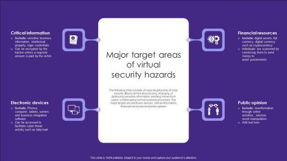 The following slide consists of major target points of cyber security attacks aimed at accessing, changing, or destroying sensitive information extorting money from users or interrupting normal business processes. The major targets are electronic devices, critical information, financial resources and public opinion Pitch your topic with ease and precision using this Major Target Areas Of Virtual Security Hazards Summary Pdf. This layout presents information on Financial Resources, Public Opinion, Electronic Devices. It is also available for immediate download and adjustment. So, changes can be made in the color, design, graphics or any other component to create a unique layout. The following slide consists of major target points of cyber security attacks aimed at accessing, changing, or destroying sensitive information extorting money from users or interrupting normal business processes. The major targets are electronic devices, critical information, financial resources and public opinion