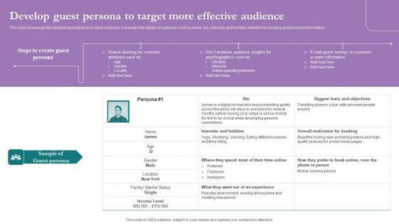 This slide showcases the detailed description of an ideal customer. It includes the details of customer such as name, bio, interests and hobbies, intention for booking and personal information. This Develop Guest Persona To Target Comprehensive Marketing Guide For Tourism Industry Pictures Pdf is perfect for any presentation, be it in front of clients or colleagues. It is a versatile and stylish solution for organizing your meetings. The Develop Guest Persona To Target Comprehensive Marketing Guide For Tourism Industry Pictures Pdf features a modern design for your presentation meetings. The adjustable and customizable slides provide unlimited possibilities for acing up your presentation. Slidegeeks has done all the homework before launching the product for you. So, do not wait, grab the presentation templates today This slide showcases the detailed description of an ideal customer. It includes the details of customer such as name, bio, interests and hobbies, intention for booking and personal information.