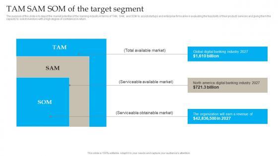 The purpose of this slide is to depict the market potential of the banking industry in terms of TAM, SAM, and SOM to assist startups and enterprise firms alike in evaluating the feasibility of their product services and giving them the capacity to solicit investors with a high degree of confidence in return. Do you have to make sure that everyone on your team knows about any specific topic I yes, then you should give Exploring The Banking Industry A Comprehensive Analysis TAM SAM SOM Of The Target Segment Pictures PDF a try. Our experts have put a lot of knowledge and effort into creating this impeccable Exploring The Banking Industry A Comprehensive Analysis TAM SAM SOM Of The Target Segment Pictures PDF. You can use this template for your upcoming presentations, as the slides are perfect to represent even the tiniest detail. You can download these templates from the Slidegeeks website and these are easy to edit. So grab these today.