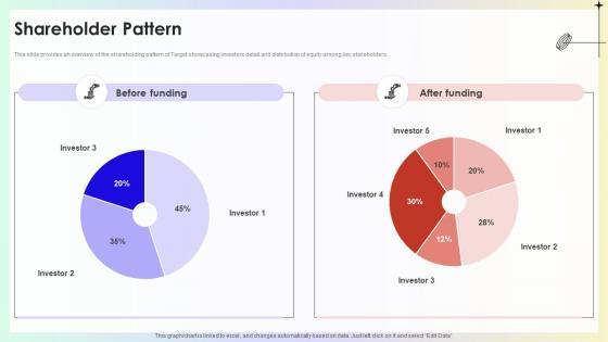 This slide provides an overview of the shareholding pattern of Target showcasing investors detail and distribution of equity among key stakeholders. This Shareholder Pattern Target Store Investor Funding Pitch Deck is perfect for any presentation, be it in front of clients or colleagues. It is a versatile and stylish solution for organizing your meetings. The Shareholder Pattern Target Store Investor Funding Pitch Deck features a modern design for your presentation meetings. The adjustable and customizable slides provide unlimited possibilities for acing up your presentation. Slidegeeks has done all the homework before launching the product for you. So, do not wait, grab the presentation templates today This slide provides an overview of the shareholding pattern of Target showcasing investors detail and distribution of equity among key stakeholders.