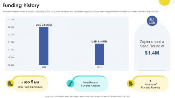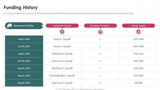 This slide covers brief overview of company funds raising journey. The purpose of this template is to provide funding announced date, total funding amount with most recent investment, number of funding rounds, etc. Slidegeeks is here to make your presentations a breeze with Funding History Task Automation Company Investor Funding Elevator Pitch Deck With our easy-to-use and customizable templates, you can focus on delivering your ideas rather than worrying about formatting. With a variety of designs to choose from, you are sure to find one that suits your needs. And with animations and unique photos, illustrations, and fonts, you can make your presentation pop. So whether you are giving a sales pitch or presenting to the board, make sure to check out Slidegeeks first This slide covers brief overview of company funds raising journey. The purpose of this template is to provide funding announced date, total funding amount with most recent investment, number of funding rounds, etc.
