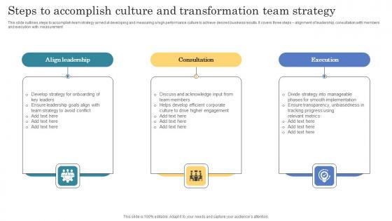 This slide outlines steps to accomplish team strategy aimed at developing and measuring a high performance culture to achieve desired business results. It covers three steps alignment of leadership, consultation with members and execution with measurement Pitch your topic with ease and precision using this Steps To Accomplish Culture And Transformation Team Strategy Slides Pdf. This layout presents information on Consultation, Execution, Leadership. It is also available for immediate download and adjustment. So, changes can be made in the color, design, graphics or any other component to create a unique layout. This slide outlines steps to accomplish team strategy aimed at developing and measuring a high performance culture to achieve desired business results. It covers three steps alignment of leadership, consultation with members and execution with measurement