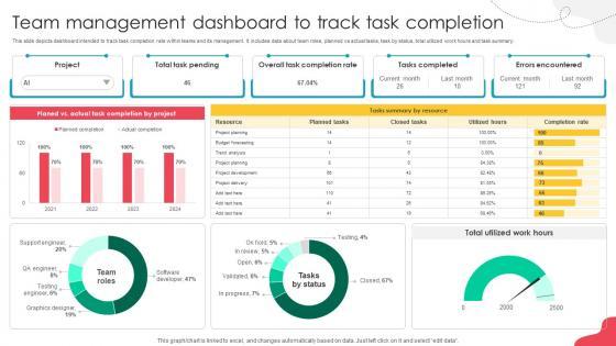 This slide depicts dashboard intended to track task completion rate within teams and its management. It includes data about team roles, planned vs actual tasks, task by status, total utilized work hours and task summary. This Unlocking Potential Enhancing Team Management Dashboard To Track Task Completion from Slidegeeks makes it easy to present information on your topic with precision. It provides customization options, so you can make changes to the colors, design, graphics, or any other component to create a unique layout. It is also available for immediate download, so you can begin using it right away. Slidegeeks has done good research to ensure that you have everything you need to make your presentation stand out. Make a name out there for a brilliant performance. This slide depicts dashboard intended to track task completion rate within teams and its management. It includes data about team roles, planned vs actual tasks, task by status, total utilized work hours and task summary.