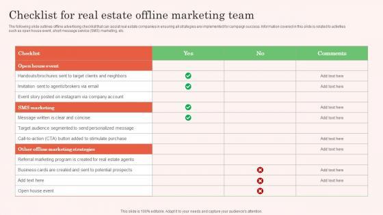 The following slide outlines offline advertising checklist that can assist real estate companies in ensuring all strategies are implemented for campaign success. Information covered in this slide is related to activities such as open house event, short message service SMS marketing, etc.Slidegeeks is here to make your presentations a breeze with Checklist For Real Estate Offline Marketing Team Real Estate Property Marketing Professional Pdf With our easy-to-use and customizable templates, you can focus on delivering your ideas rather than worrying about formatting. With a variety of designs to choose from, you are sure to find one that suits your needs. And with animations and unique photos, illustrations, and fonts, you can make your presentation pop. So whether you are giving a sales pitch or presenting to the board, make sure to check out Slidegeeks first. The following slide outlines offline advertising checklist that can assist real estate companies in ensuring all strategies are implemented for campaign success. Information covered in this slide is related to activities such as open house event, short message service SMS marketing, etc.