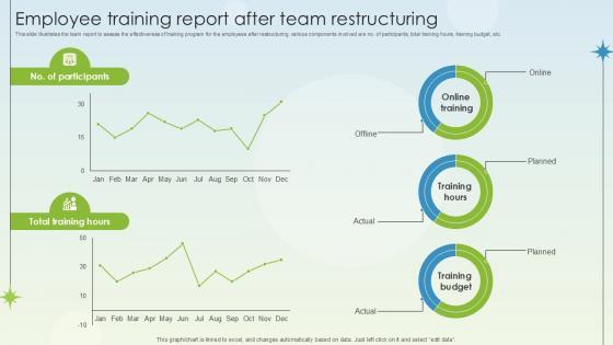 This slide illustrates the team report to assess the effectiveness of training program for the employees after restructuring. various components involved are no. of participants, total training hours, training budget, etc. Want to ace your presentation in front of a live audience Our Employee Training Report After Team Restructuring Business Growth Ppt Slides can help you do that by engaging all the users towards you. Slidegeeks experts have put their efforts and expertise into creating these impeccable powerpoint presentations so that you can communicate your ideas clearly. Moreover, all the templates are customizable, and easy-to-edit and downloadable. Use these for both personal and commercial use. This slide illustrates the team report to assess the effectiveness of training program for the employees after restructuring. various components involved are no. of participants, total training hours, training budget, etc.