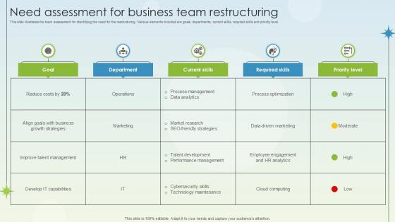 This slide illustrates the team assessment for identifying the need for the restructuring. Various elements included are goals, departments, current skills, required skills and priority level. Want to ace your presentation in front of a live audience Our Need Assessment For Business Team Restructuring Business Growth Ppt Template can help you do that by engaging all the users towards you. Slidegeeks experts have put their efforts and expertise into creating these impeccable powerpoint presentations so that you can communicate your ideas clearly. Moreover, all the templates are customizable, and easy-to-edit and downloadable. Use these for both personal and commercial use. This slide illustrates the team assessment for identifying the need for the restructuring. Various elements included are goals, departments, current skills, required skills and priority level.