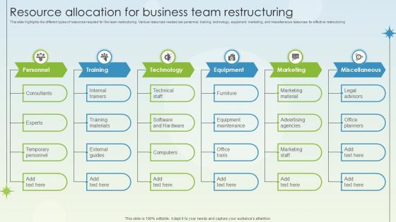 This slide highlights the different types of resources required for the team restructuring. Various resources needed are personnel, training, technology, equipment, marketing, and miscellaneous resources for effective restructuring Slidegeeks is here to make your presentations a breeze with Resource Allocation For Business Team Restructuring Business Growth Ppt Template With our easy-to-use and customizable templates, you can focus on delivering your ideas rather than worrying about formatting. With a variety of designs to choose from, you are sure to find one that suits your needs. And with animations and unique photos, illustrations, and fonts, you can make your presentation pop. So whether you are giving a sales pitch or presenting to the board, make sure to check out Slidegeeks first This slide highlights the different types of resources required for the team restructuring. Various resources needed are personnel, training, technology, equipment, marketing, and miscellaneous resources for effective restructuring