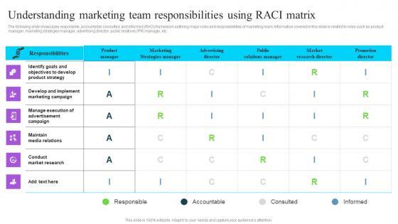 The following slide showcases responsible, accountable, consulted, and informed RACI framework outlining major roles and responsibilities of marketing ream. Information covered in this slide is related to roles such as product manager, marketing strategies manager, advertising director, public relations PR manager, etc. Want to ace your presentation in front of a live audience Our Understanding Marketing Team Responsibilities Using Effective GTM Techniques Sample PDF can help you do that by engaging all the users towards you. Slidegeeks experts have put their efforts and expertise into creating these impeccable powerpoint presentations so that you can communicate your ideas clearly. Moreover, all the templates are customizable, and easy-to-edit and downloadable. Use these for both personal and commercial use. The following slide showcases responsible, accountable, consulted, and informed RACI framework outlining major roles and responsibilities of marketing ream. Information covered in this slide is related to roles such as product manager, marketing strategies manager, advertising director, public relations PR manager, etc.