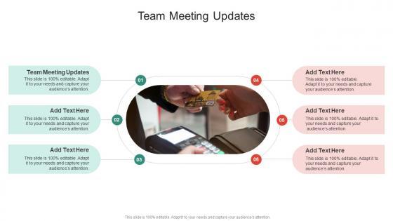 Introducing our well designed Team Meeting Updates In Powerpoint And Google Slides Cpb. This PowerPoint design presents information on topics like Team Meeting Updates. As it is predesigned it helps boost your confidence level. It also makes you a better presenter because of its high quality content and graphics. This PPT layout can be downloaded and used in different formats like PDF, PNG, and JPG. Not only this, it is available in both Standard Screen and Widescreen aspect ratios for your convenience. Therefore, click on the download button now to persuade and impress your audience. Our Team Meeting Updates In Powerpoint And Google Slides Cpb are topically designed to provide an attractive backdrop to any subject. Use them to look like a presentation pro.