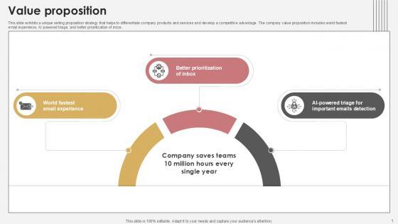 This slide exhibits a unique selling proposition strategy that helps to differentiate company products and services and develop a competitive advantage. The company value proposition includes world fastest email experience, AI powered triage, and better prioritization of inbox. Explore a selection of the finest Value Proposition Communication Tech Company Pitch Deck PPT Template here. With a plethora of professionally designed and pre-made slide templates, you can quickly and easily find the right one for your upcoming presentation. You can use our Value Proposition Communication Tech Company Pitch Deck PPT Template to effectively convey your message to a wider audience. Slidegeeks has done a lot of research before preparing these presentation templates. The content can be personalized and the slides are highly editable. Grab templates today from Slidegeeks. This slide exhibits a unique selling proposition strategy that helps to differentiate company products and services and develop a competitive advantage. The company value proposition includes world fastest email experience, AI powered triage, and better prioritization of inbox.