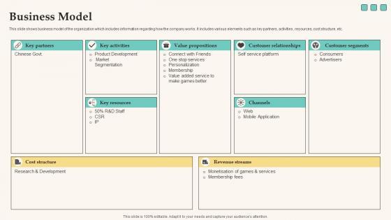 This slide shows business model of the organization which includes information regarding how the company works. It includes various elements such as key partners, activities, resources, cost structure, etc. Boost your pitch with our creative Business Model Elevator Pitch Deck For Funding Tech Company Portrait Pdf. Deliver an awe-inspiring pitch that will mesmerize everyone. Using these presentation templates you will surely catch everyones attention. You can browse the ppts collection on our website. We have researchers who are experts at creating the right content for the templates. So you do not have to invest time in any additional work. Just grab the template now and use them. This slide shows business model of the organization which includes information regarding how the company works. It includes various elements such as key partners, activities, resources, cost structure, etc.