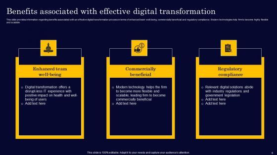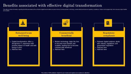 This slide provides information regarding benefits associated with an effective digital transformation process in terms of enhanced team well-being, commercially beneficial and regulatory compliance. Modern technologies help firm to become highly flexible and scalable. Boost your pitch with our creative Benefits Associated With Effective Gen Tech Stack Playbook Guidelines Pdf. Deliver an awe-inspiring pitch that will mesmerize everyone. Using these presentation templates you will surely catch everyones attention. You can browse the ppts collection on our website. We have researchers who are experts at creating the right content for the templates. So you do not have to invest time in any additional work. Just grab the template now and use them. This slide provides information regarding benefits associated with an effective digital transformation process in terms of enhanced team well-being, commercially beneficial and regulatory compliance. Modern technologies help firm to become highly flexible and scalable.