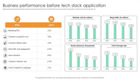 Mentioned slide provides information about business current performance. It includes KPIs such as website visit, blog traffic, social share, click through rate, etcPresent like a pro with Business Performance Before Tech Stack Application Comprehensive Guide For Marketing Technology. Create beautiful presentations together with your team, using our easy-to-use presentation slides. Share your ideas in real-time and make changes on the fly by downloading our templates. So whether you are in the office, on the go, or in a remote location, you can stay in sync with your team and present your ideas with confidence. With Slidegeeks presentation got a whole lot easier. Grab these presentations today. Mentioned slide provides information about business current performance. It includes KPIs such as website visit, blog traffic, social share, click through rate, etc