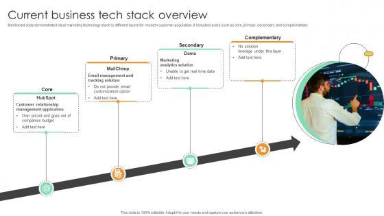 Mentioned slide demonstrated ideal marketing technology stack by different layers for modern customer acquisition. It includes layers such as core, primary, secondary, and complementary. Retrieve professionally designed Current Business Tech Stack Overview Comprehensive Guide For Marketing Technology to effectively convey your message and captivate your listeners. Save time by selecting pre-made slideshows that are appropriate for various topics, from business to educational purposes. These themes come in many different styles, from creative to corporate, and all of them are easily adjustable and can be edited quickly. Access them as PowerPoint templates or as Google Slides themes. You do not have to go on a hunt for the perfect presentation because Slidegeeks got you covered from everywhere. Mentioned slide demonstrated ideal marketing technology stack by different layers for modern customer acquisition. It includes layers such as core, primary, secondary, and complementary.