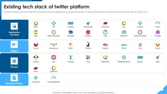 This slide covers existing tech stack for twitter platform to represent tools and technologies used to develop and design application. It includes various applications such as jQuery, Node.js, React, MySQL, Redis, Dyn, Docker, Jira etc.Showcasing this set of slides titled Existing Tech Stack Of Twitter Platform Microsoft Pdf The topics addressed in these templates are Existing Tech Stack, Twitter Platform All the content presented in this PPT design is completely editable. Download it and make adjustments in color, background, font etc. as per your unique business setting. This slide covers existing tech stack for twitter platform to represent tools and technologies used to develop and design application. It includes various applications such as jQuery, Node.js, React, MySQL, Redis, Dyn, Docker, Jira etc.