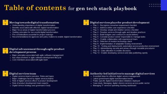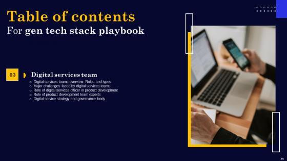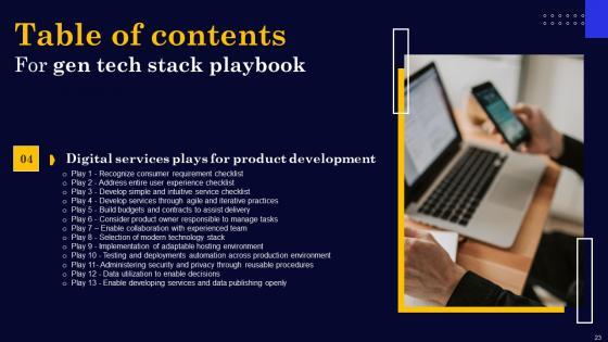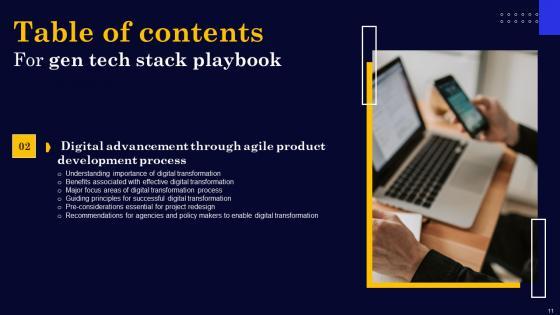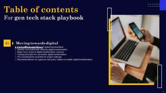 Take your projects to the next level with our ultimate collection of . Slidegeeks has designed a range of layouts that are perfect for representing task or activity duration, keeping track of all your deadlines at a glance. Tailor these designs to your exact needs and give them a truly corporate look with your own brand colors they will make your projects stand out from the rest Our Table Of Contents For Gen Tech Stack Playbook Gen Tech Stack Playbook Pictures Pdf are topically designed to provide an attractive backdrop to any subject. Use them to look like a presentation pro.